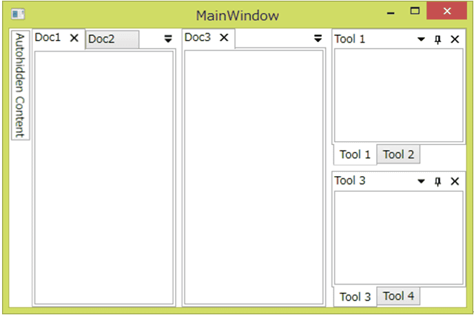 このパネルは、それらの間で(Orientationのプロパティで選択する)方向に沿って、寸法変更機能を追加し、枠の子を配置します。 上のLayoutPanelでは、水平方向に3つの枠(LayoutAnchorablePaneは左側に、LayoutDocumentPaneは中央部に、LayoutDockablePaneは右側に)を配置されています。