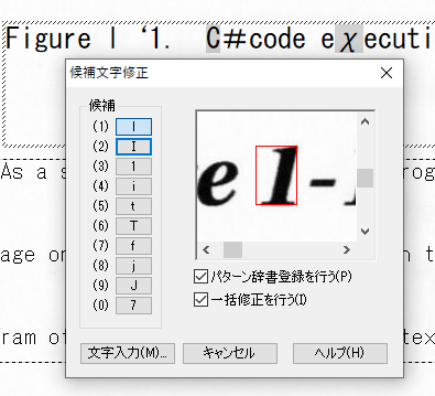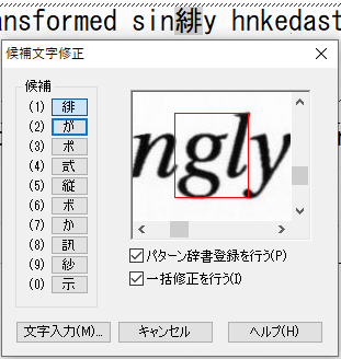 文字を指定すると、類似した文字の一覧が表示されます。一覧から項目を表示すると、認識画像、認識結果テキストの該当部分が選択されて見えるように移動します(認識画像は、移動がきちんと動作しておらず、見えない領域にあることが多々あります)。今回修正する文字と違う文字を選択し、右下の[修正対象からはずす]ボタンを押して、リストから削除します。リストは、Ctrlキーを押して選択すると複数選択ができ、マウスでドラッグしても複数選択ができます。リスト内の項目を同じ認識文字だけにして、[OK]をクリックすると、一度にまとめて修正されます。